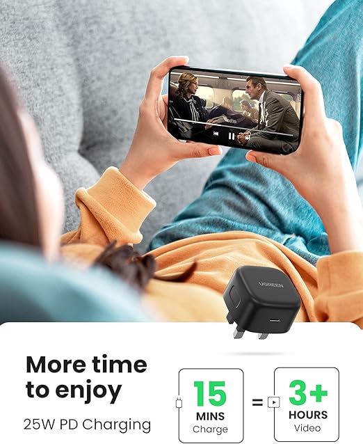 - 25W PD Fast Charger:Â 25w Power Delivery output enables this UGREEN USB Charger to charge at a full speed, it can be fully charged from 0% to 100% within only 63min, which is much faster than normal charging adapter